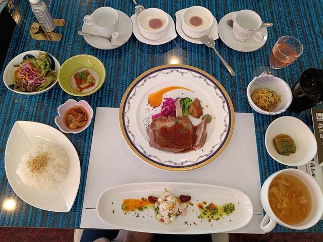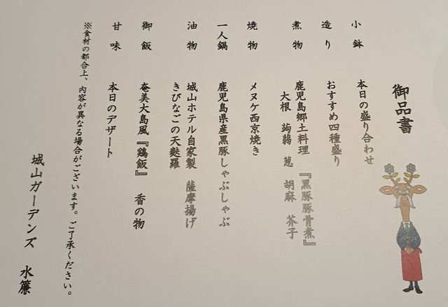 ホテルへ帰った後は、温泉に入ってから、ホテル内のレストラン「城山ガーデンズ 水簾」で夕食です。ホテルは、とても大きいため、迷子になる人が続出していたようですが、私たちは同じツアーの人の後ろに付いて行ったので、迷うことはありませんでした。レストランは、滝を臨む洗練された空間で、和食のコースは、とても美味しかったです。しかし、メインは再び黒豚しゃぶしゃぶでしたので、少し飽きて来ました(笑)。