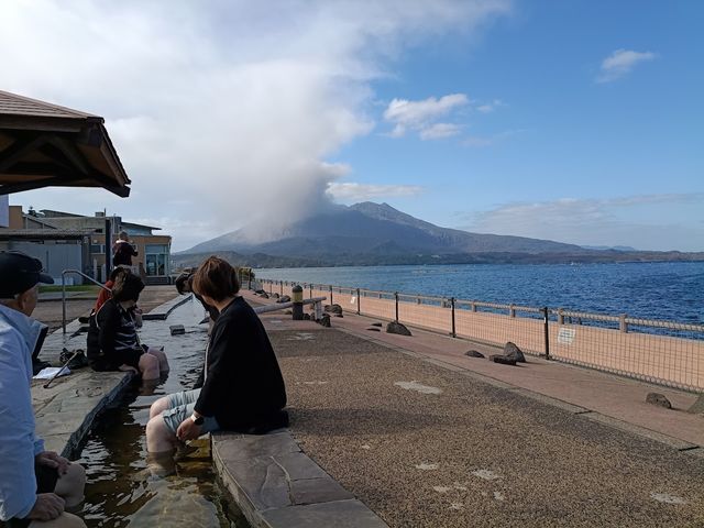 黒酢の郷を出た後は、桜島の東側を錦江湾沿いに進みます。桜島の東側にある道の駅たるみず湯っ足り館で休憩して、写真に示す足湯に入ったのですが、桜島の噴煙がこちら側に向かって流れて来ていること分かります。道の駅を出てさらに桜島に近づくと、風に乗って火山灰が降ってきて、バスの車体やガラス窓にも細かな灰が付きます。しかし、鹿児島の人たちは、桜島の噴火は日常のことなのか、みんな普通に車を運転しています。牛根大橋を渡って桜島に入り、島の南側を通って東側から西側に進むと、火口から風上側となるため、火山灰が止んで青空が広がりました。