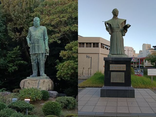 湯之平展望所からの360度の眺望を楽しんだ後は、桜島港から観光バスごとフェリーに乗船して、対岸の鹿児島港へと向かいます。フェリーから後ろを振り返ると、噴煙を上げる桜島がはっきりと見えました。鹿児島港に着いた後は、再びバスに乗って市街地の中央にある城山公園に向かい、今夜の宿である城山ホテル鹿児島に着きました。予定よりもかなり早く着いて夕食まで時間があったので、ホテルの無料シャトルバスに乗って、鹿児島市内の見学に出かけました。GooglMapを片手に1時間ほど散策して、小松帯刀像や西郷隆盛像を見学することができました。