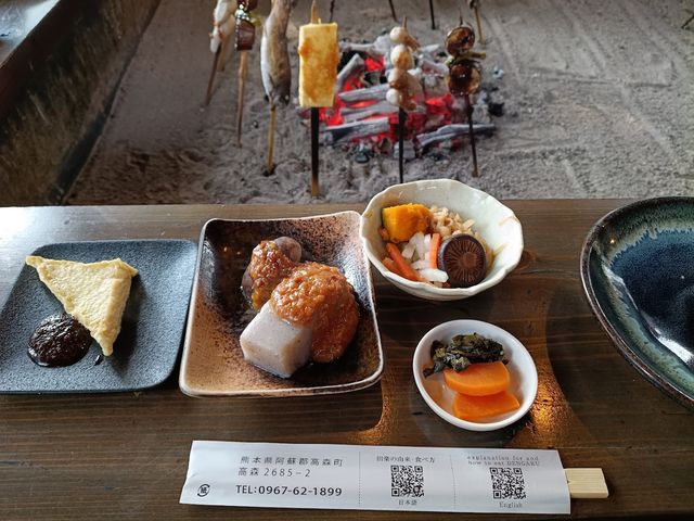 熊本空港に到着した後は、さっそく観光バスに乗って、阿蘇カルデラ南側の高森町にある高森田楽の里へと行って、店名にもなっている田楽定食を昼食に頂きました。写真に示すように、囲炉裏で炭火で焼いた里いも、やまめ、豆腐、なすの田楽の他、こんにゃく、生揚げ、だご汁、キビめし、煮物、漬物などが付いています。他のツアー客には、あまり評判が良くなかったようですが、私は、いつもより朝食を早く食べてお腹が空いていたので、美味しく頂けました(笑)。