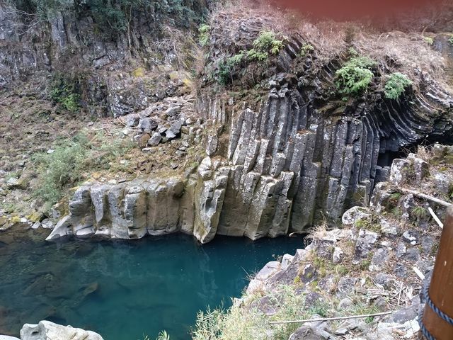 昼食の後は、また観光バスに乗って、広大な阿蘇カルデラの南側を横切って、宮崎県北部にある神話の里=高千穂へと向かいます。最初に訪れた高千穂峡は、阿蘇山の火山活動と五ヶ瀬川の侵食活動によって形作られた、風光明媚な観光名所です。この渓谷は、高さ約80~100mもの柱状節理の断崖が、東西に約7キロに渡って続く、深く・狭く・長く・美しい渓谷です。バス駐車場から、遊歩道を渓谷沿いに下って行くと、写真に示すように、柱状節理の断崖が両岸にそそり立ち、谷底にはエメラルドグリーンの水面が広がり、まさに神話の国に相応しい雰囲気があります。