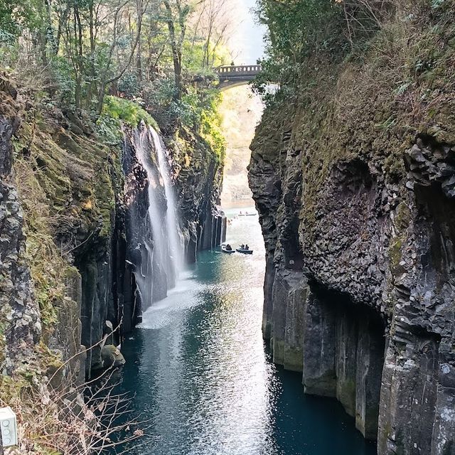 真名井の滝は、高千穂峡のパンフレットやビデオにも必ず出てくる有名スポットで、歩いてきた遊歩道の終点付近にありました。滝見台からは、本当に神秘的な真名井の滝と渓谷を見ることができ、素人の私でも、とても素敵な写真が撮れました。しかし、しばらくするとたくさんの観光ボートがやって来て、水面が渋滞中の道路のようになって、少し興醒めしてしまいました。