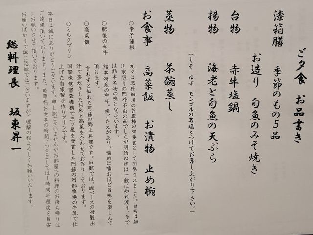 夕食は、写真に示すような和会席で、品数も比較的多く、それなりに満足できました。熊本では、赤牛、高菜飯、だご汁がよく出てきたのですが、どのお店も結構美味しかったです。夕食では、飲み放題になかったビールを飲んだのは、言うまでもありません(笑)。