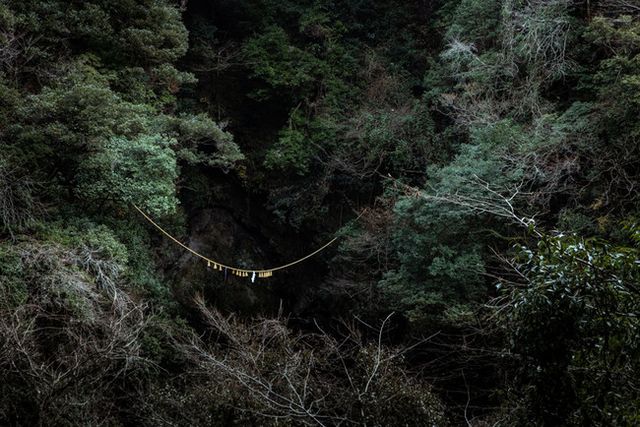拝殿裏は、撮影禁止のため、残念ながら御神体の「天岩戸」の写真は、撮影できませんでした。しかし、天岩戸に注連縄を張る神事『天岩戸注連縄張り神事』が、プロ登山家の竹内洋岳氏らによって、令和2(2020)年に神話及び神社創建以来初めて実施され、それ以降毎年の冬至に注連縄張りが実施されています。その時に撮影された「天岩戸」が、(株)ハニーコミュニケーションズのプレスリリースに掲載されています。貴重な「天岩戸と注連縄の写真」を以下に転載しますので、興味のある人はご覧ください。