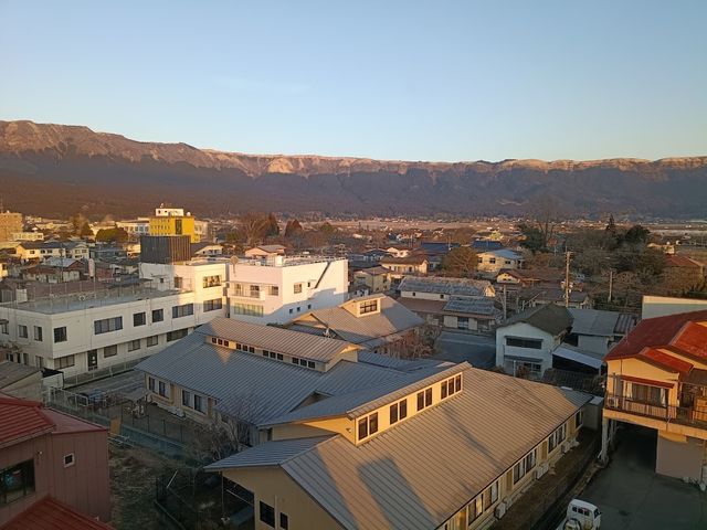 2日目は、ホテルからの出発が9時と遅いので、朝起きてからゆっくりと朝風呂に入って、朝食を食べてから部屋で少しのんびりしました。ホテルの窓から外を見ると、写真に示すように、阿蘇カルデラの外輪山が朝日を浴びてとても綺麗です。ほぼ同じ高さの山が、壁のように周りを取り囲んでいて、自分たちが阿蘇カルデラの中にいることを実感しました。