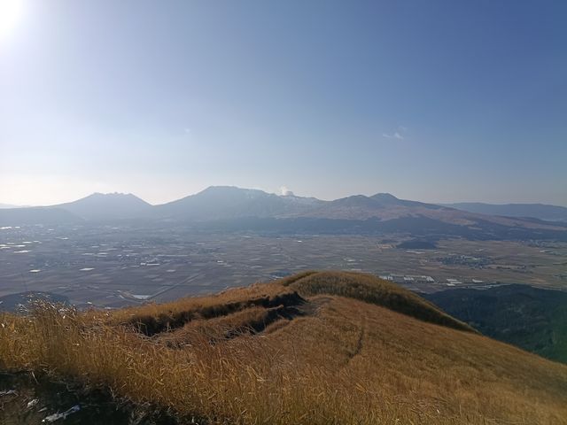また、北側に目を向けると、外輪山の上部に大草原が広がっているのが見え、そのはるか向こうには、九州最高峰の中岳(標高1791m)を含む九重連山を望むことが出来ます。さらに、西側に目を向けると、有明海を挟んで遠くに雲仙普賢岳が見えていました。霞んでいて写真には写りませんでしたが、とても天気が良くて、360℃の展望を楽しむことができました。