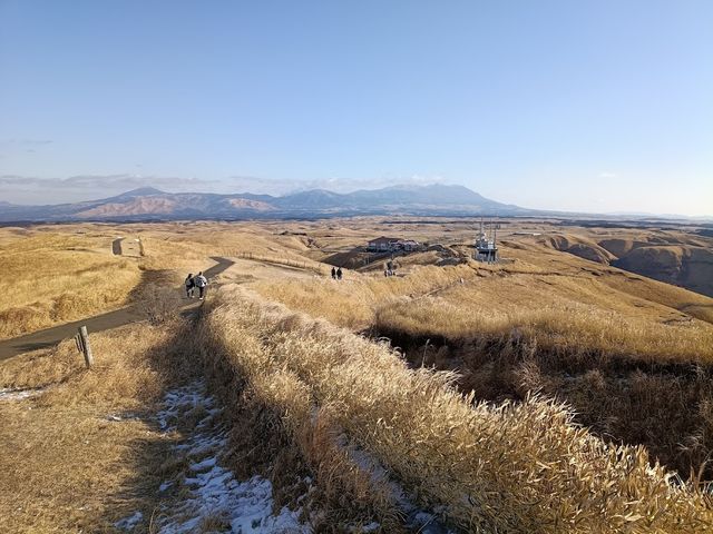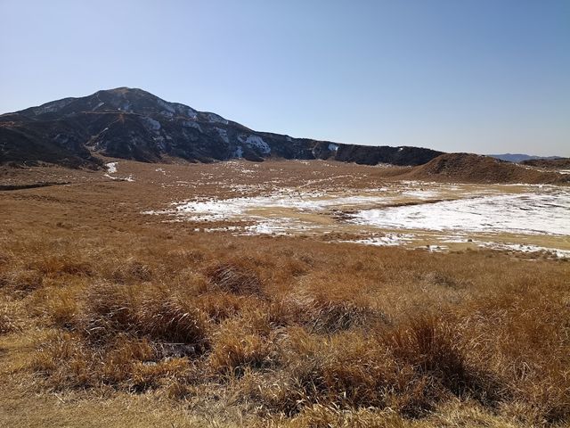 阿蘇神社で参拝した後は、阿蘇カルデラの中央にあり、阿蘇山を代表する観光地のひとつである草千里ヶ浜へと向かいます。草千里は、阿蘇五岳の烏帽子岳の北麓に広がる、直径約1kmの広大な二重の火口跡で、夏には広々とした草地の中で牛や馬が草を食む風景が人気です。しかし、真冬の草千里には、写真に示すように枯草が広がり、火口跡には雪が積もって寒々としています。