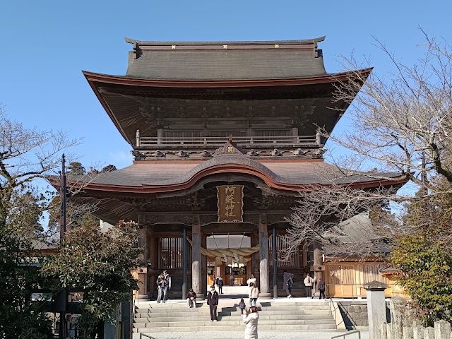大観峰から360℃の眺望を楽しんだ後は、外輪山の上からカルデラ内の阿蘇谷へ下って、阿蘇谷の東側にある阿蘇神社へと向かいます。阿蘇神社は、神武天皇の孫神で阿蘇を開拓した健磐龍命(たけいわたつのみこと)をはじめ家族神12神を祀り、2000年以上の歴史を有する古社です。2016年の熊本地震では、重要文化財の楼門を始め、拝殿なども完全に潰れてたのですが、約1年前に復旧工事が完了したそうです。写真に示す復旧された楼門から境内に入って、同じく復旧された拝殿に行って、お祈りをさせて頂きました。