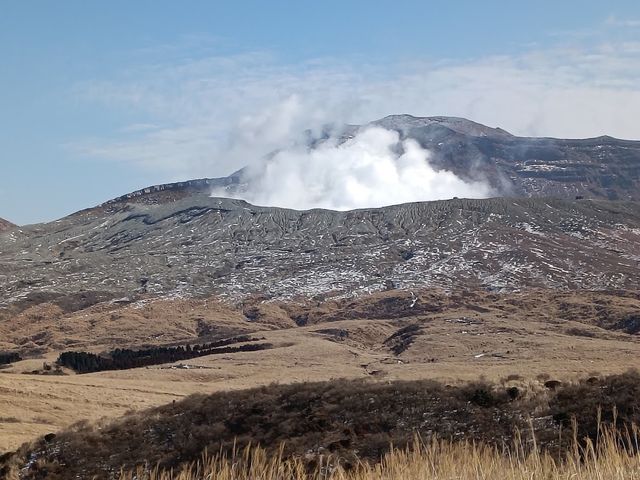草千里東側の丘の上に登ると、写真に示すように、噴煙を上げるダイナミックな阿蘇中岳火口を見渡すことができます。しかし、丘の上は、快晴なのにとても風が強く、体感温度が低くて長い間景色を楽しむことができません。熊本でも冬は、高い山では雪が降るし、とても寒いということを実感しました。