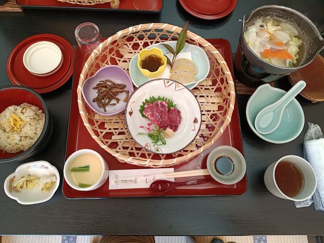 草千里ヶ浜と中岳火口の雄大な景色を堪能した後は、山道を下って阿蘇谷へ戻り、日本料理さか本で昼食です。お昼から、写真に示すような美味しそうな郷土料理が並んでおり、食欲をそそります。辛子蓮根、馬刺し、だご汁、高菜飯など、どれも美味しいのですが、私は、この中でも、ピリリと辛い辛子蓮根が気に入りました。