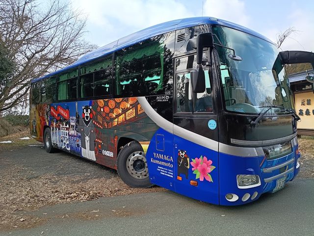 朝食を食べた後に、バスに乗り込みますが、今回のバスは、写真に示すようなラッピングバスとなっています。バスの側面や背面には、くまモンと一緒に山鹿の八千代座や灯篭祭りが描かれています。バスガイドさんによれば、「九州産交バスにも、ラッピングバスは数台しかなく、車体に描かれている場所へ行くのはとても珍しいので、今回のお客さんはとてもラッキー!!」とのことでした。また、「八代亜紀さんは、九州産交バスのバスガイド大先輩で、熊本公演などではOBとしていつも利用して頂きました」との裏話もありました。