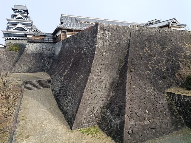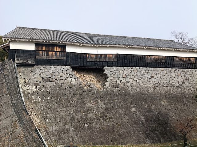 また、特別見学通路からは、写真に示すように地震で崩れたままの石垣や建物も間近に見ることができます。さらに、積み方の異なる二つの石垣=二様の石垣も、特別見学通路の上から、全体を眺めることが出来ます。写真の右手の隅部の勾配が緩やかな石垣は、築城当初の加藤時代のもので、左手の勾配が急な石垣は、細川時代に増築されたと言われていました。しかし、地震後の修復工事に伴う調査の結果、左手の石垣は細川時代より前、加藤忠広の時代に築かれたと思われますが、まだ確定はしていません。