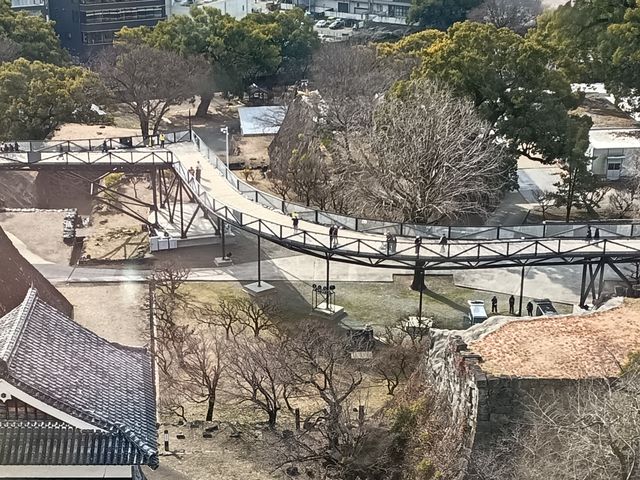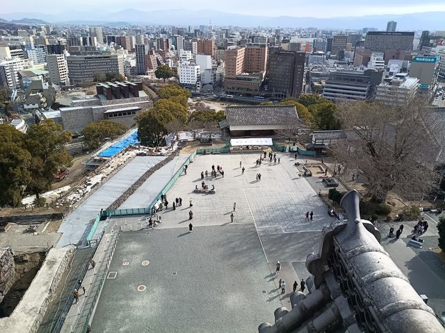 特別見学通路の階段を登って本丸へと向かい、天守閣前広場から別名銀杏城とも呼ばれる熊本城の立派な天守閣が聳えています。天守閣に登って見下ろすと、眼下に熊本市街が広がっていますが、天守閣広場の左側では、まだ石垣などの修復工事が行われていることが分かりました。早く、全ての修復工事が完全に終わるといいですね!