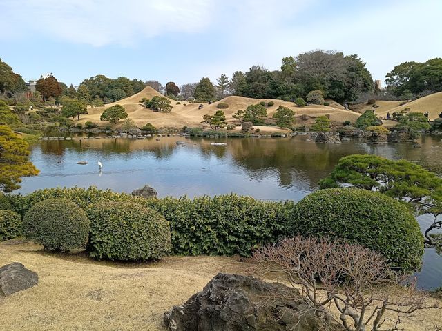 水前寺公園は、正式名称を水前寺成趣園と言い、江戸時代に細川忠利公が築いた回遊式庭園で、東海道五十三次を模した景観が特徴の、国指定の名勝・史跡です。写真に示すように、琵琶湖に見立てた池の周りに、富士山を模した築山のある日本庭園です。しかし、それ以外の場所が、五十三次の何処に相当するのか、私にはよく分かりませんでした(笑)。